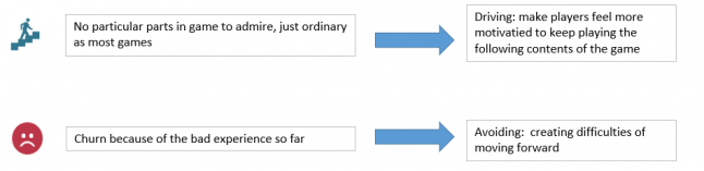 When we were doing tutorial playtesting, we focused more on usability problems and detecting potential obstacles, which only solves the problem of how games stopping players at a certain point. But a game itself is not just a product that should only stay on making players feel satisfying, it should make players feel stunned by its special features and unique design. Improving players’ perception of special features of the game could probably increase players’ motivation to continue to explore the game. Mapping the emotional journey of players is an applicable method of checking if players could possibly perceive the demonstration of special feature in different stage in game. Emotional journey map can show the emotional state of players in each stage, visually reflecting the degree of player interests in game, and can further compare with the planned feature settings to get a clear clue of which feature or unique design is missed by players.