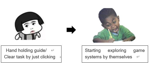 Let’s get back to the features of this stage, which is requiring players to invest more energy and time to better handling the following game contents. In addition to whether the player's cognitive level can complete this part of the free exploration or not, there is one more important point to be mentioned, which is players’ willingness to explore the following content. Just like a child who was not interested in piano learning, after finishing the class in the training program, he couldn't get interested in practicing by himself when he gets home, let alone trying other new songs in advance.