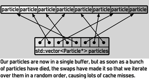 This code is simple enough, but if we look at it from a cache perspective, it's highly inefficient. The problem is that every time we create a new particle with new, it's placed in a random free spot somewhere in memory. That means that all the particles will be spread out over memory. The line particles[i]->position += speed; is now very slow, because it will result in a cache miss most of the time. The time the processor spends waiting for the particle's position to be read from memory is much greater than the time that simple addition takes.