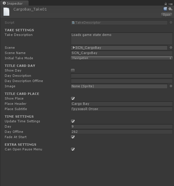 This is what the Take Inspector looks like. It contains some information that will be presented to the player in the form of an entry card inside the game scene.