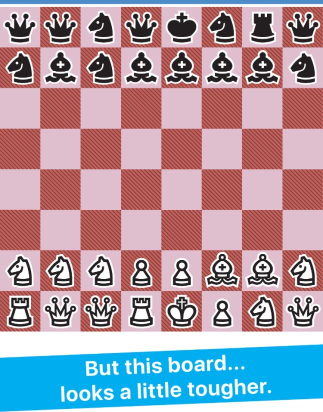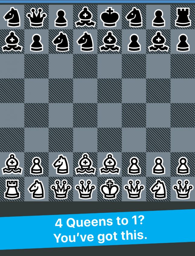 Available now on iOS, it takes the traditional rules of chess and lays waste to them. The board is the same, and the pieces behave the same way. But you and your A.I. opponent receive a random collection of pieces. You could wind up playing with four Kings, five Bishops, and seven Pawns. Your opponent might have nine Bishops.