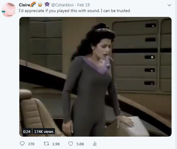This is an edited gif of Deanna Troi farting. I’d like to apologise in advance to Marina Sirtis who by all accounts is a wonderful human and was in one of my fav games of all time, Mass Effect.