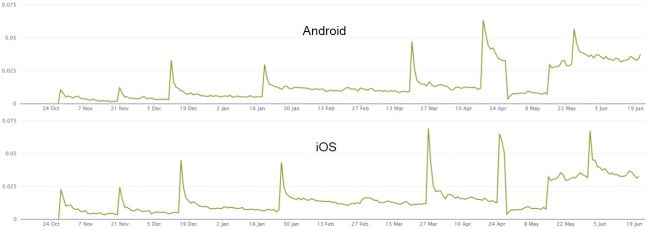The third issue is diversity – the more in-game visual content you provide for your characters, the easier it is for players to personalize their heroes. As such, you need a lot of content. Here’s how the share of spent hard currency grew with each new pack of released War Robots skins (note that the “drop” in April-May isn’t a drop in sales, but an event that increased the total amount of spent currency, with no impact on skin sales).
