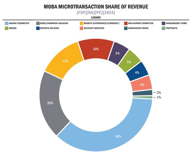 In 2015, EEDAR, a specialist market research and data analysis firm, published a report containing a chart with MOBA microtransaction revenue shares. The chart confirmed the views of those looking to "sell visuals" – "cosmetic" products are an undeniable bestseller amongst successful MOBAs.