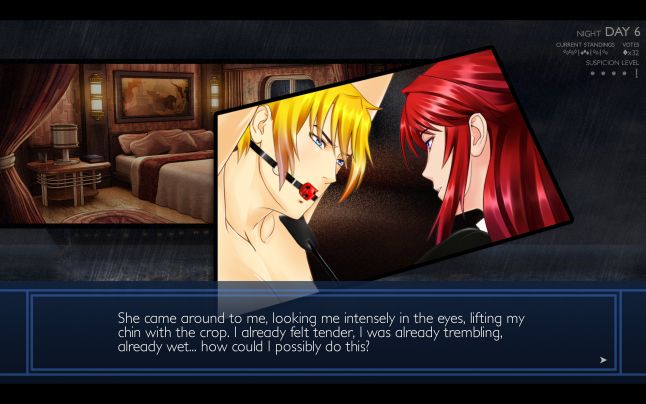 So, what does all this have to do with the game’s sexuality? For one, seduction and sex are means by which the Beast improves her position and saves her skin (if not from every conceivable wound); votes can be procured through sex, or leverage can be gained to help you acquire votes elsewhere. But there’s a thematic element here that I find fascinating, and it’s simply this: The Beast’s relationship with The Beauty--the most BDSM-heavy relationship by far, availing itself as it does of every letter in that acronym--is the most authentic relationship on that boat.