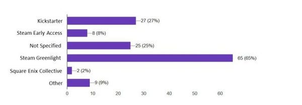 In terms of public validation, 65% of the games chose Steam Greenlight while 5% are available on Itch.io. With the disappearance of Steam Greenlight and the Steam access price increase, Itch.io is likely to grow as a platform for early access and public validation.
