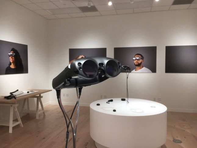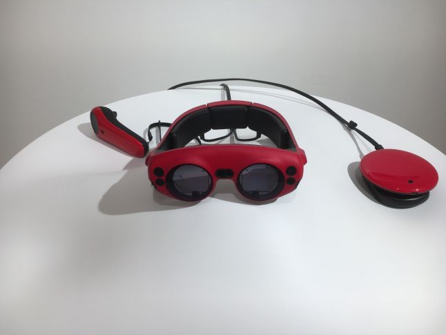 The goggles are branded Lightwear, the puck PC is a Lightpack, and there's a red version on display at Magic Leap