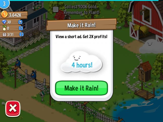 Unity's research has found that the most effective advertising approach at present is to offer opt-in rewarded video ads. This usually involves placing a button or menu somewhere in a game where players can watch video ads — usually 30 seconds each — for bonus lives or in-game currency, or perhaps a resource boost.