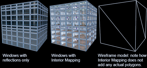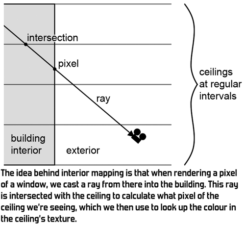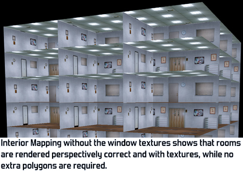 After having published this blogpost one of the programmers of Simcity (2013) told me that interior mapping was also used in that game. It looks really cool there and they have a nice video showing it off. They improved my original idea by storing all the textures in a single texture and having rooms of varying depth. The part about interior mapping starts at 1:00 in this video: