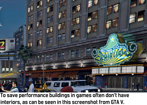 As you can see around 0:40 in this video the rooms aren't actually there in the geometry: there's a door where there should clearly be a window. You also see a different interior when you look at the same room from a different corner of the building. In some cases there's even a wall that's beyond a corner of the building. All of these suggest that the rooms are faked, but nevertheless they are entirely perspectively correct and have real depth. I expect the faults of these rooms don't matter much because while playing you probably normally don't actually look at rooms as closely as in that video: they're just a backdrop, not something to scrutinise. I think creating rooms this way adds a lot of depth and liveliness to the city without eating up too much performance.