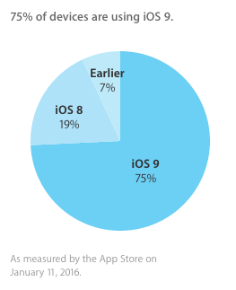 Newsbrief: iOS developers take note: Apple's latest OS version, iOS 9, is now on 75 percent of Apple's devices, the company revealed today via an updated chart on its App Store developer portal.