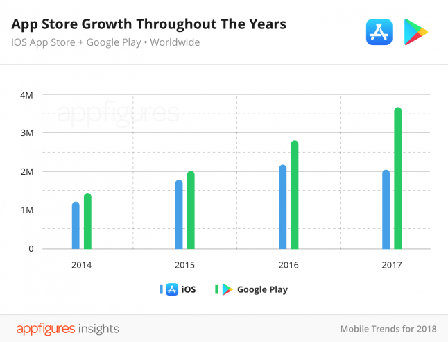 Both the App Store and Google Play store had been experiencing consistent growth until now, and while Apple's marketplace took a hit, Google's continued to surge upwards, growing by a rate of 30 percent to more than 3.6 million apps.