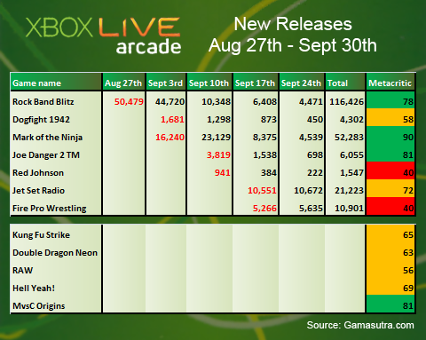 And Klei Entertainment's stealth-based action title Mark of the Ninja, the only September release with a higher Metacritic average (91) than Joe Danger 2, also performed well, moving over 50,000 copies in its first month. Its second-week sales actually exceeded its opening-week numbers. As for previously released games, Mojang and 4J Studios' Minecraft: Xbox 360 Edition continues to sell plenty of copies four months after its release, adding a little less than 100,000 players each week on average throughout September. Hidden Path Entertainment and Valve's multi-platform August release Counter-Strike: Global Offensive also sold well, bringing in 106,000 new players last month. Gamasutra contributor Ryan Langley has made more charts and analysis for XBLA's September 2012 sales available here.
