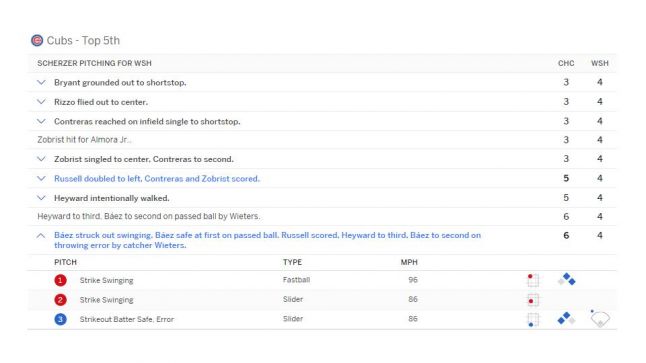...it’s not actually true. The batter is not out after the third strike. It’s only when the catcher catches the ball that the batter is out. If the catcher drops or misses the pitch, then the batter is not out and has a chance to advance to first. This almost always results in an out as the catcher simply picks up the ball and makes the easy throw, but occasionally, this little-known rule can become a big deal, as it did in last year’s final game in the playoff series between the Chicago Cubs and the Washington Nationals. Max Scherzer threw a third strike past a swinging Javier Baez, but watch what happens...
