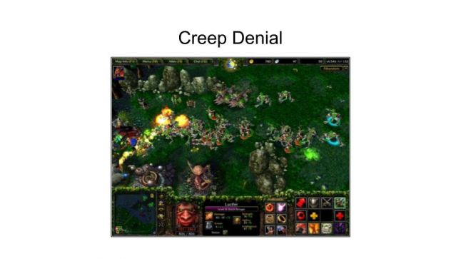 At the very least, creep denial is ACCIDENTAL design because DOTA inherited it from Warcraft 3 - this was simply how that game handled killing your own units. Indeed the fact that Warcraft 3 even ALLOWED killing your own units was likely an afterthought by the designers. DOTA inherited this rule because the game was literally built inside of Warcraft 3 as a mod. Thus, MOBAs inherited a ton of design and mechanics from Warcraft 3. The original DOTA</