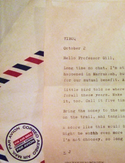 These videos were password protected, which presented the first goal of the ARG. To unlock the videos, the players had to decipher a series of coded messages sent in hand-typed letters to some of our higher-tier backers. Those messages each contained the name of an actor and a timestamp, which they could use to locate quotes from famous pulp adventure movies.