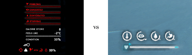 Another useful thing we can learn is how to maximize the use of bar indicators. Wrapping health bars in to a circle can save space. It also makes the UI more visually appealing, with icons large and easy to understand quickly. Notice the lack of numbers that we are accustomed to seeing with bar UI elements. They can still be found in the inventory, but in the HUD there is no need for them. Numbers take more time to read, when all the player needs to understand is if a certain condition is high/low, going up/down.