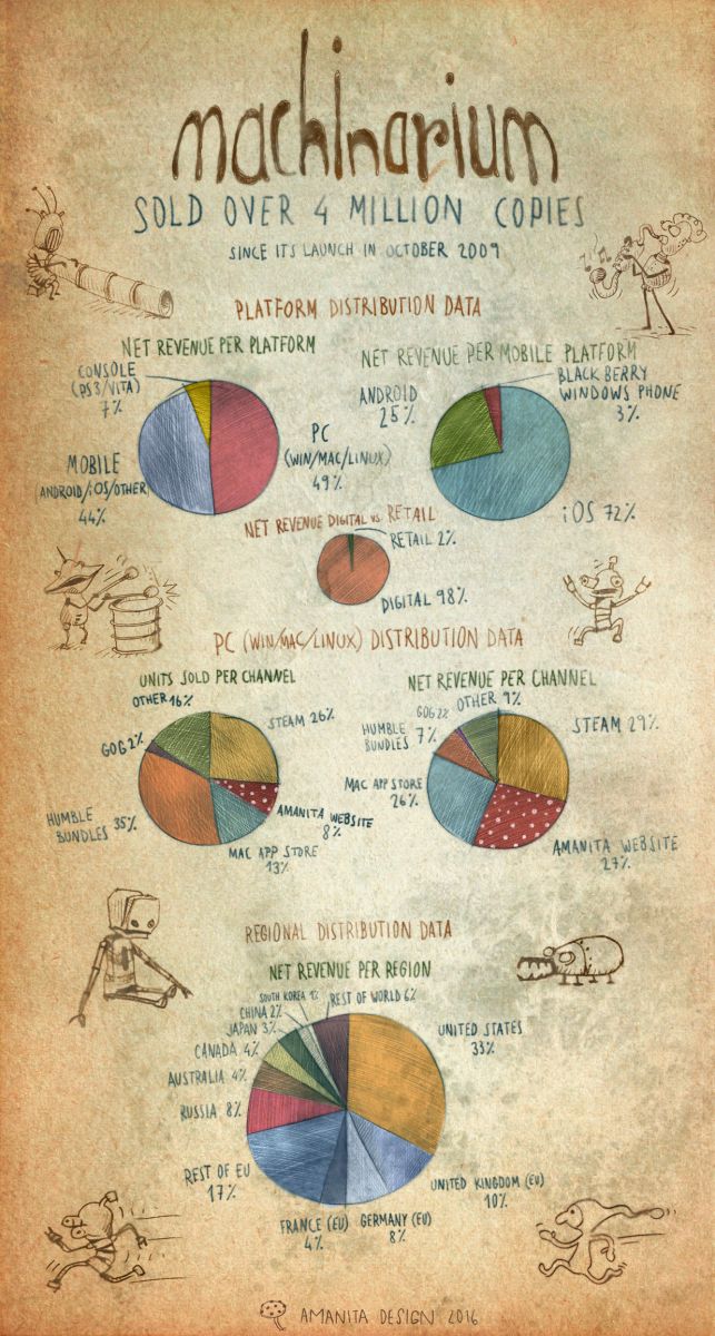 Machinarium came out on PC in October 2009 and since then it has been ported to many platforms including PS3, PS Vita, iOS, Android and more. It's our most successfull game to date, selling well on almost every platform for years. It has sold over 4 million copies and it's commercial success which helped us finance fully independent development of other games like Botanicula and our latest and biggest title Samorost 3. Check out the infographic with some platform breakdowns and other graphs.