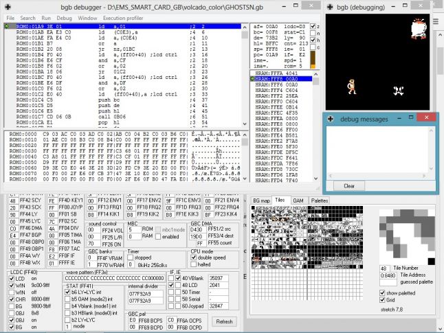 Last but not least, we also need a way to test our game. This is where modernity is key. While in the 90's developers had to use expensive ICE boxes, today we have powerful software emulators that can run on any computer. To test your own game, the best choice is BGB. It's a very accurate Game Boy emulator that comes with a powerful debugger, the one tool you'll need to create a working game!