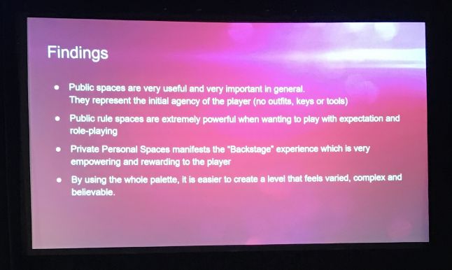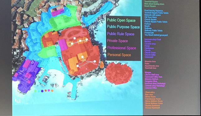 With these in mind, she shares a mapped out overview of Sapienza made to highlight how these spaces are represented throughout the level. She does the same for the other five levels in Hitman (2016), but points out that “someone did all of this without having all these social spaces being formalized,” but without the labels she’s now applied to each zone “it just wasn’t accessible to me as a new designer.”