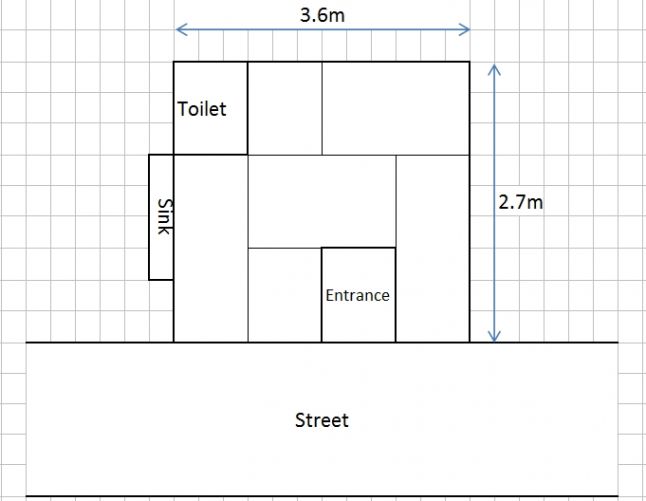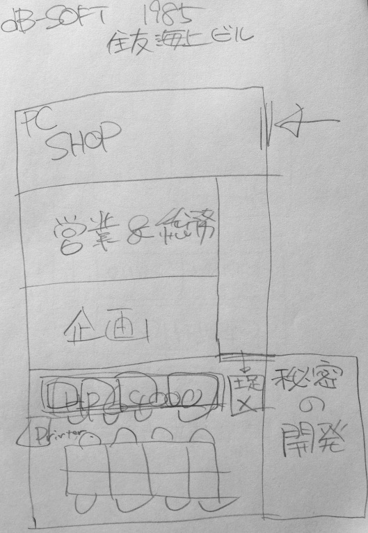 A sketch showing early Falcom by Ichikawa, who worked part-time when he was only 14! This would be around the mid-1980s. Notice how large the shop area is, effectively taking up 50% of the floorspace.