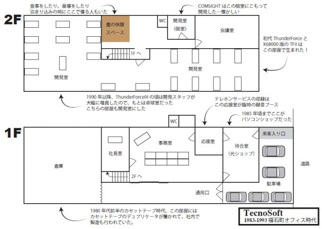 Not much is given away here other than the fact TecnoSoft had a mysterious "secret room", and the fact its sound department occupied a (quite literally) central role. However, compare this hand-drawn sketch with the following map of the same office...