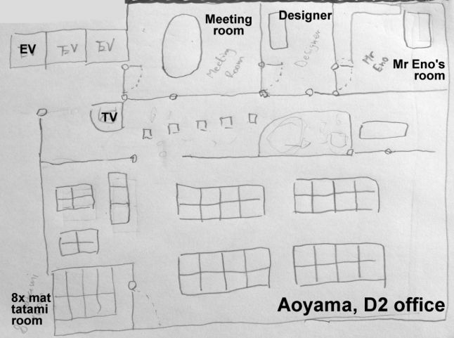 "Here in the corner they had a tatami mat room, about 8 tatami in size, that was designed so people could have a sleep. Because the programmers were working very late. But everybody would just sleep at their desks, put a jacket over their heads and just crash out. There was always someone working at these desks, 24 hours a day. Essentially the people lived in the office. Eno-san would basically live in the office. They were not made to stay in the office, and I don't think the hours they had to work were that long, but because it was rendering video - especially back then it could take 20 plus hours - what you would do is, you would hit 'render' for the bit you were working on and then just go to sleep. Then four hours later you'd wake up, go to the next one, hit render, and that's what a lot of people did."