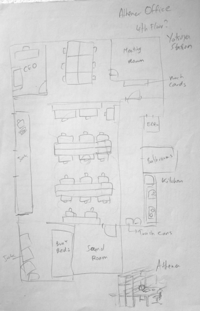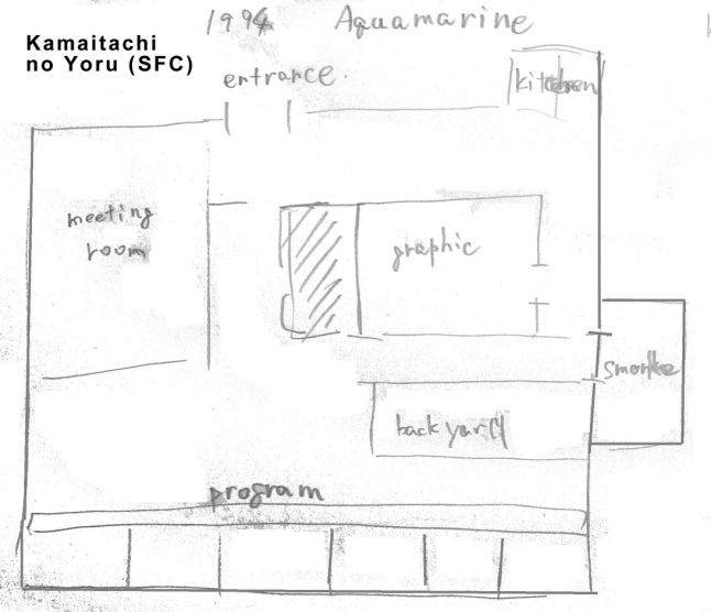 Kamaitachi no Yoru was a landmark release for Japanese visual novels, so it's sad to consider the company folded, despite the game itself seeing multiple re-releases right up to the present. Note the smoking room, which is common for a lot of Japanese developers, even today (NudeMaker has one!). YN: "Although I was doing work for Chunsoft, I was working at a different company office. <sketches> It was like this. We had this separate room for taking a smoke break. <laughs> And there was a partition here... This was the meeting room, this was the graphic section I think. The programming team was here. And there was a storage area here. And there was a kitchenette for making tea and coffee. I was there until around 1998."
