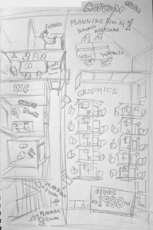 Drawn by a pixel artist this map itself is quite beautiful, and shows how much emphasis Capcom placed on creating graphics. Ten desks in a dedicated room, taking up at least 1/3 of the entire floor, with a comparatively smaller planning room adjacent. There's also the typical WC and "crash room" for tired staff to sleep in. Top of the map is Tokuro Fujiwara, creator of Ghosts 'n Goblins, in his own office.