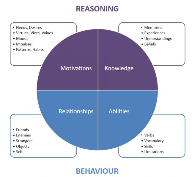 In my previous blog post, I explored the considerations for how to approach generating personalities, and ended by proposing these personalities are formed through four components: Motivations, Relationships, Ability, and Knowledge. Here, I made a nice chart for you:
