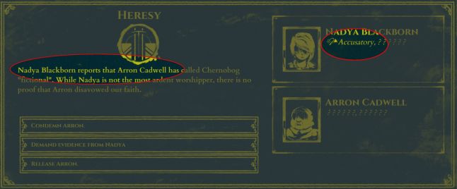 If Nadya's virtue were only displayed as "??????" in a Shrouded Isle event, the accusation event would then provide a clue -- maybe Nadya is Accusatory, or maybe Arron really is a blasphemer, or maybe both. Later, when the truth is discovered, this is a learning/"aha!" moment for the player.