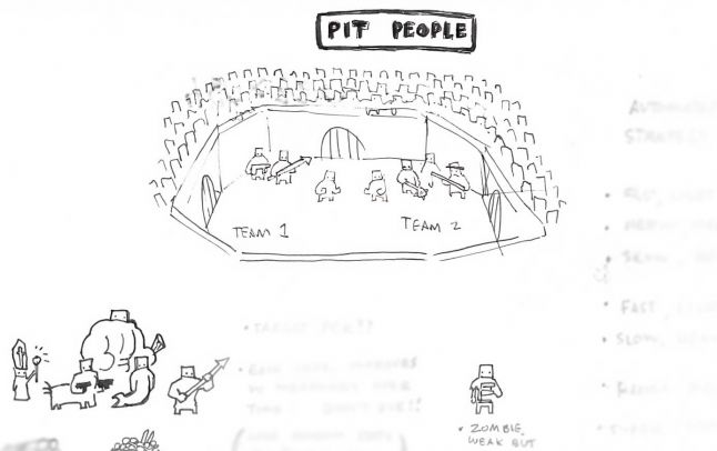 Much of the original design for Pit People sprang from a single, early sketch. "One of our brainstorm sketches we had was one that closely resembles what's there now. The name and even some of the fighter types were kept from that original sketch!"