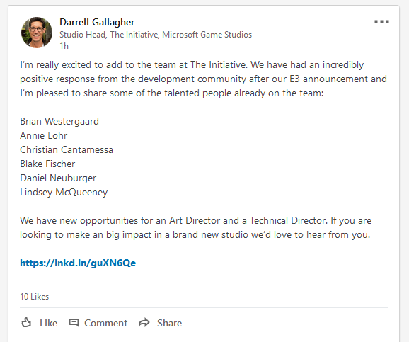 Gallagher initially welcomed the newest additions to the team on LinkedIn, but has since deleted the post. ResetEra user CrimsonEclipse was able to screenshot the news before the post was removed.