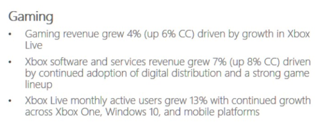 Game industry types will mostly care about the company's video game business, and Microsoft claims that gaming revenue (which includes sales of Xbox consoles) increased 4 percent year-over-year.