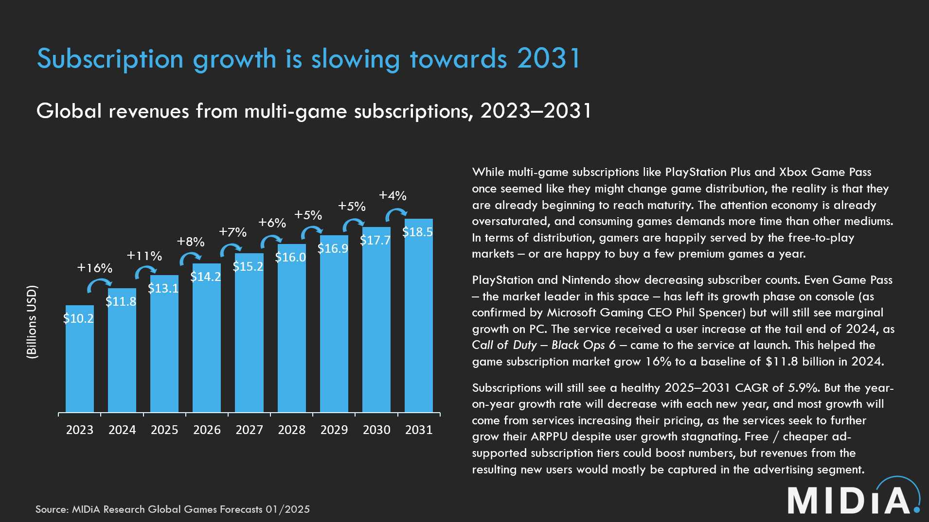 Midia highlights how Call of Duty's addition to Xbox Game Pass helped overall subscription service numbers rise by 16% YoY to $11.8 billion in 2024. It predicts this amount to grow further in 2025 to $13.1 billion, followed by $18.5 billion in 2031.