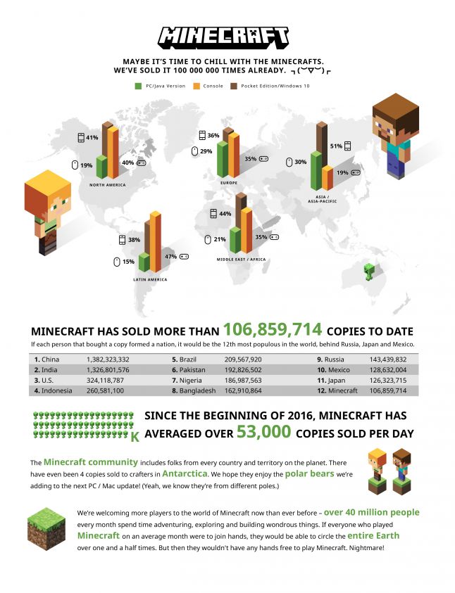 In an infographic posted on the Mojang blog today, director of creative communications Owen Hill writes that Minecraft has sold over 100 million copies worldwide.