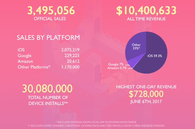 The information comes from a refreshingly insightful infographic whipped up by developer ustwo, which shows the game racked up 3.5 million official sales across all platforms.