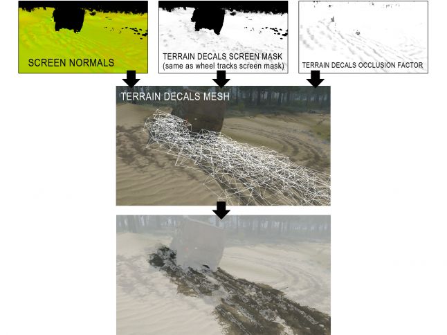In the same fashion as wheel tracks, after the terrain and most of environment is rendered (it’s called “Color Pass” and it uses MRT – multiple render targets), we have screen normals (used to compute lighting) and terrain decals screen mask (masks out objects that decals shouldn’t be rendered on top of). Color Pass also write occlusion factor for terrain decals so they can be lit more naturally. Decals are z-projected on top of the scene.