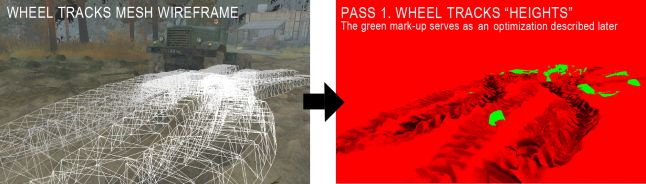 Traditional parallax effect takes multiple sample from associated “heights” texture and then offsets texture coordinates accordingly (we won’t go into details of the math of it). Problem is, if you are z-projecting your texture onto z-buffer, there is no easy way to make said samples. That is why wheel tracks are rendered in 2 passes. The visual artifacts are neglectable with that approach, you just need to make sure you don’t sample from parts of the texture where you don’t have wheel track height info at (that’s what green mark-up of wheel track heights texture is for).