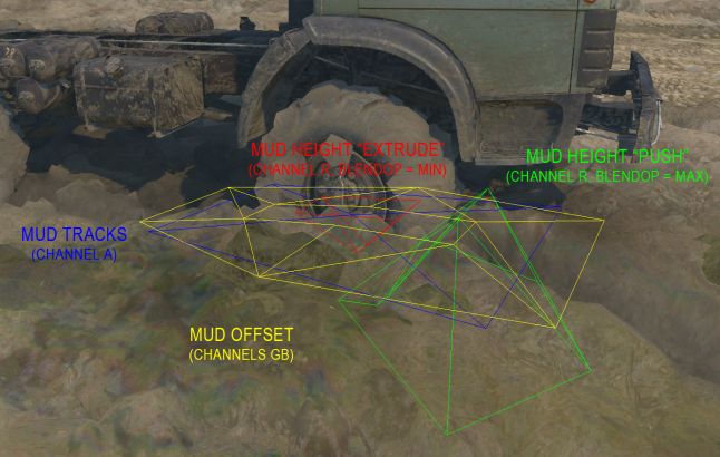 A (alpha) channel – marks portions of base terrain that are substituted by the mud, it’s the only channel that is dynamically updated as vehicles deform terrain.