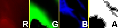 G (green) channel – grass/dirt materials mix factor. Currently, each block can only mix 2 materials.