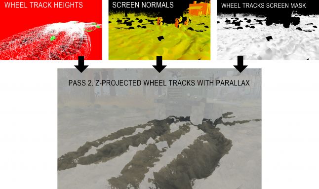 Wheel track heights are required for parallax effect. The textures are projected onto terrain using Z buffer. The tricky part is ordering tracks properly (more recent tracks should cover older tracks). There are several approaches to do this, we use GPU-only method: render tracks with their own z-buffer (so no hardware z-test against scene), and offset more recent tracks towards the camera in vertex shader. Z-test against the scene is performed manually inside pixel shader.