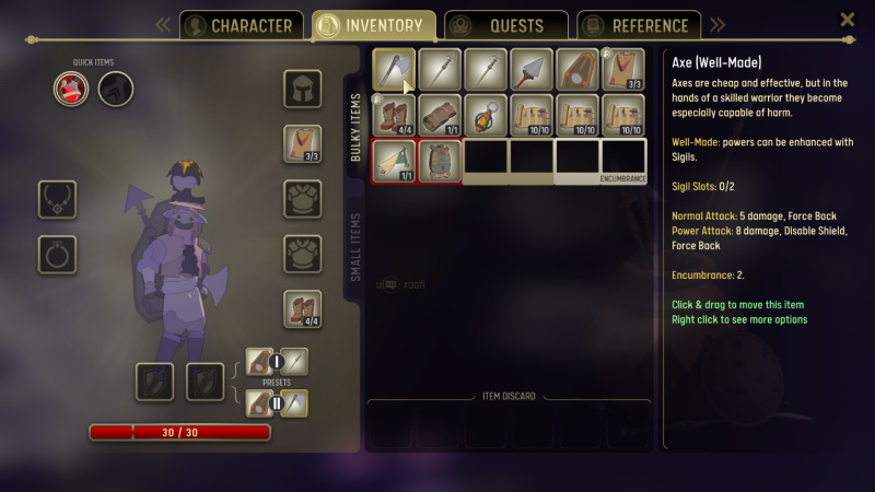 Figure 4 - The inventory redesigned, 14 item collectively causing 6 encumbrance. The last two items are placed on encumbrance spots meaning the hero is now encumbered.