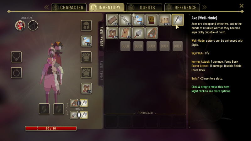 So we sat down and discussed the options. Simply expanding the number of inventory slots to 21 or 24 didn’t seem like a good idea to us. First of all, we were afraid that it would also flush out everything we liked about the inventory system. Planning well for a journey becomes less rewarding when it is all too easy to pack for every eventuality. And second, in our experience players are going to fill up their inventory eventually no matter how much room you give them. And when they do, it does nothing to prevent that frustrating moment where you have to decide what to leave behind right now in order for you to pick up that cool item you just found.
