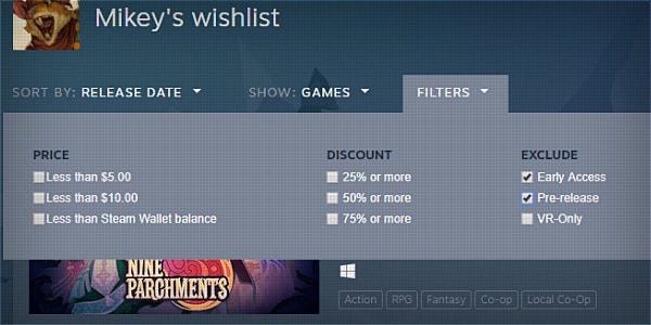 The other new filters that hit Steam today allow players to hide Early Access, VR-Only, and Pre-release on their Wishlist or display only games that are less than $5, less than $10, less than that player's Steam Wallet Balance. Additionally, Steam users can now filter games in their wishlists by popular tags.