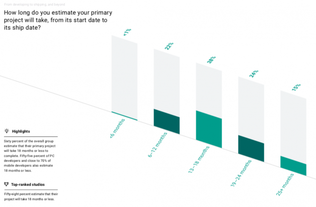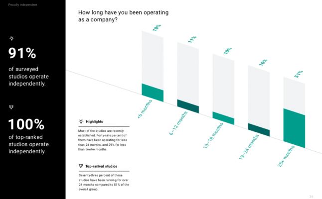 Meanwhile, only 25 percent of studios under 6 months old own or rent an office space. The majority, 64 percent, instead opt to work remotely while 61 percent of studios over 2 years old own or rent an office.