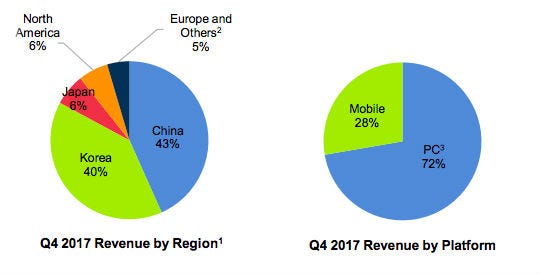 China led Nexon’s overall fourth-quarter revenue gain, followed by Korea, Japan, North America, and Europe. China’s ¥22.8 billion (~$209.5 million) revenue made up 43 percent of the company’s overall revenue for the quarter.