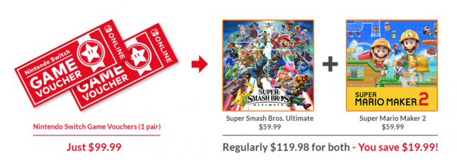 The vouchers themselves will remain valid for 12 months after purchase, and can only be used to purchase select titles, most of which are first-party offerings like Super Mario Maker 2, Super Smash Bros. Ultimate, Breath of the Wild, Mario Kart 8 Deluxe, Super Mario Odyssey, and Splatoon 2.