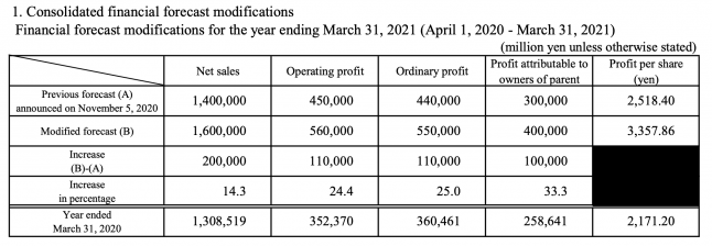 As highlighted in the company's fiscal report for the nine months ended December 31, 2020, net sales increased by 37.3 percent year-on-year to 1.4 trillion yen ($13.3 billion), while profits rose by 91.8 percent to 376.6 billion yen ($3.5 billion) over the same period.