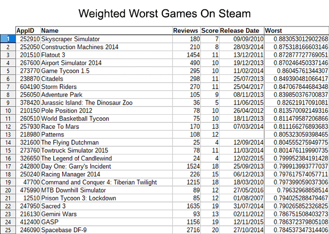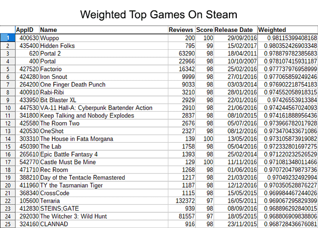 It's very similar to Steam's official top rated games page, with the notable exception of #1 game Wuppo and a couple of others. This is because Steam's official page sorts the results into "buckets", and to get into the top "Overwhelmingly Positive" bucket you need a score of at least 95% and at least 500 reviews. It's essentially a more primitive way of weighting the results so that games with few reviews don't top the charts. But it means that even though Wuppo has a score of 100%, since it only has 200 reviews total it has to slip in later past all the Overwhelmingly Positive games.